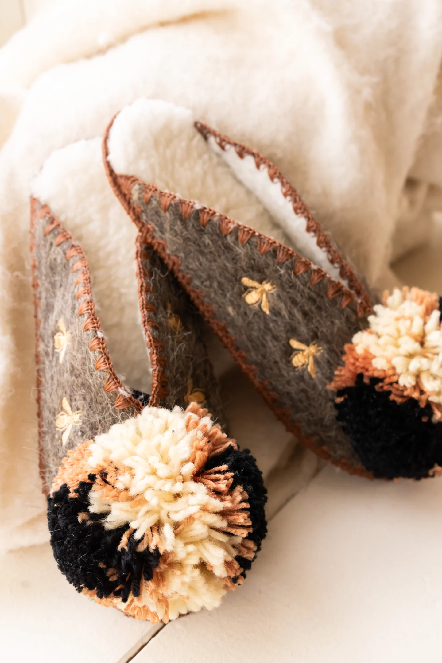 Ces mules Fanfan sont fabriqués en laine vierge de mouton non teintée, d’un mélange de fils de laine vierge et d’une semelle en cuir antidérapante .