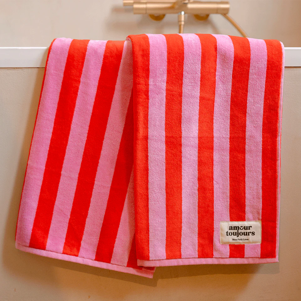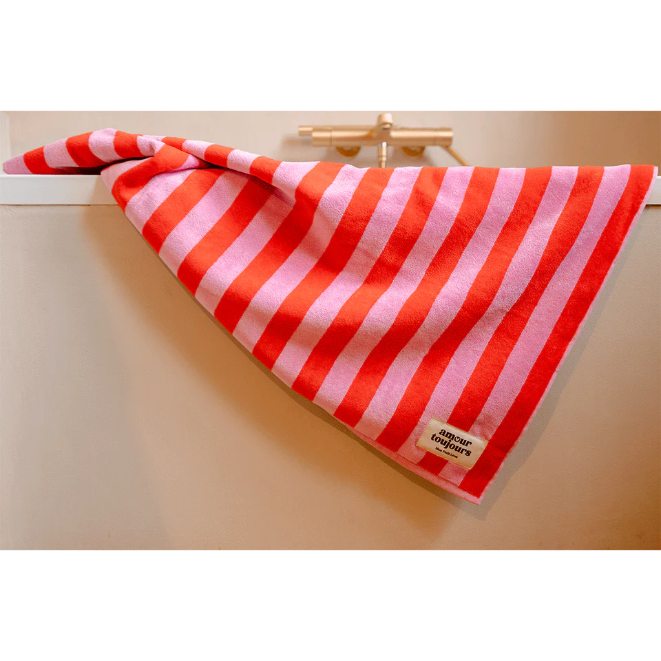 Une serviette de bain toute douce et mixte, avec ses belles rayures rouges et roses, c’est LE produit à offrir ou à s’offrir pour (se) faire plaisir.
