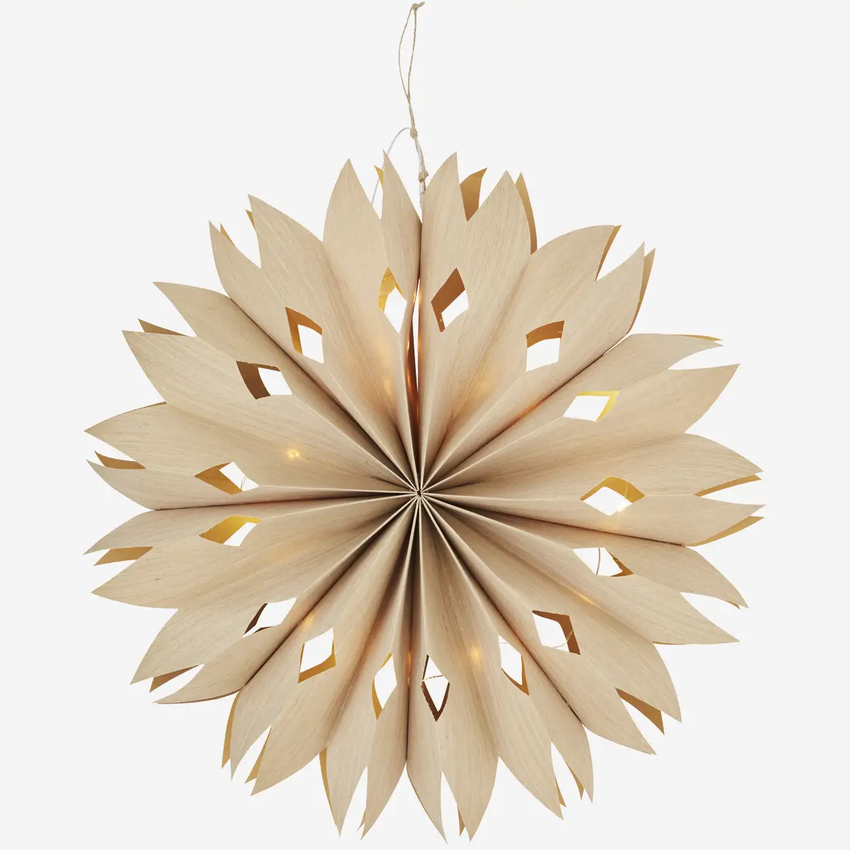Cette étoile en papier de 50 cm de diamètre est équipée de 15 leds ( à piles fournies). Vous pourrez la suspendre pour votre décoration d’intérieur.