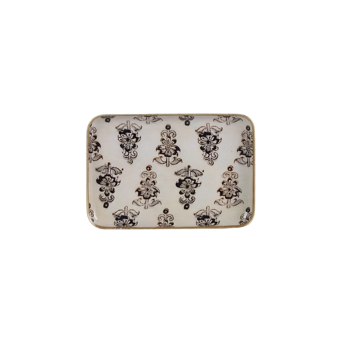Plateau métal émaillé avec bordure dorée peinte à la main.Ce plateau peut présenter de légères imperfections qui sont la marque de son caractère artisanal.