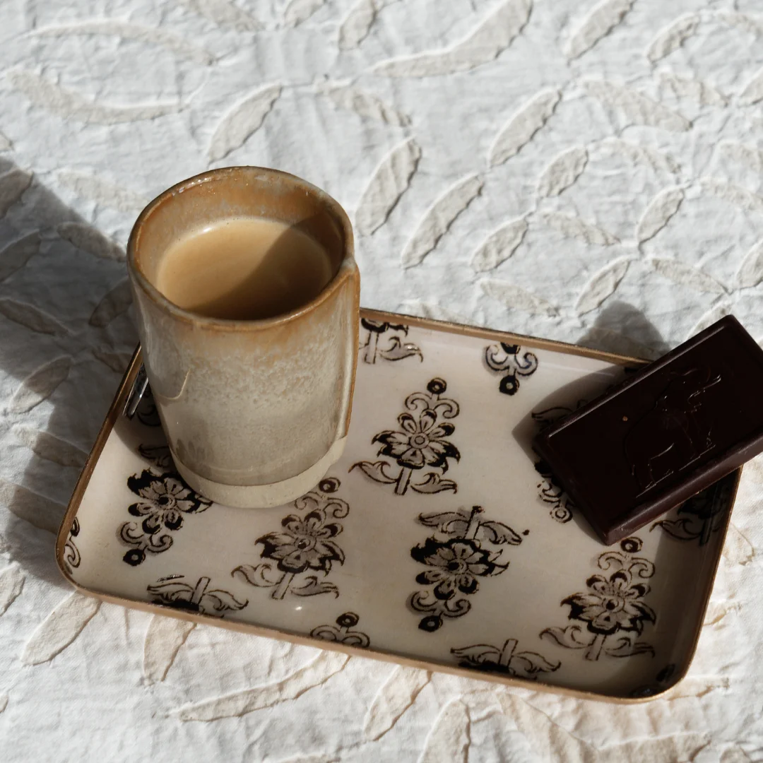 Ce plateau rectangulaire au motif classique noir sur fond écru apporte une touche d’élégance intemporelle à votre table