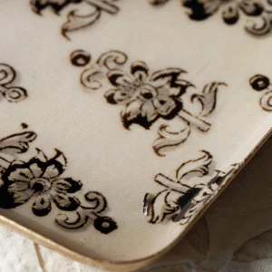 Plateau métal émaillé avec bordure dorée peinte à la main. Ce plateau peut présenter de légères imperfections qui sont la marque de son caractère artisanal.